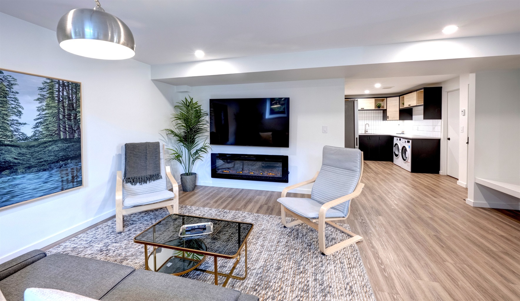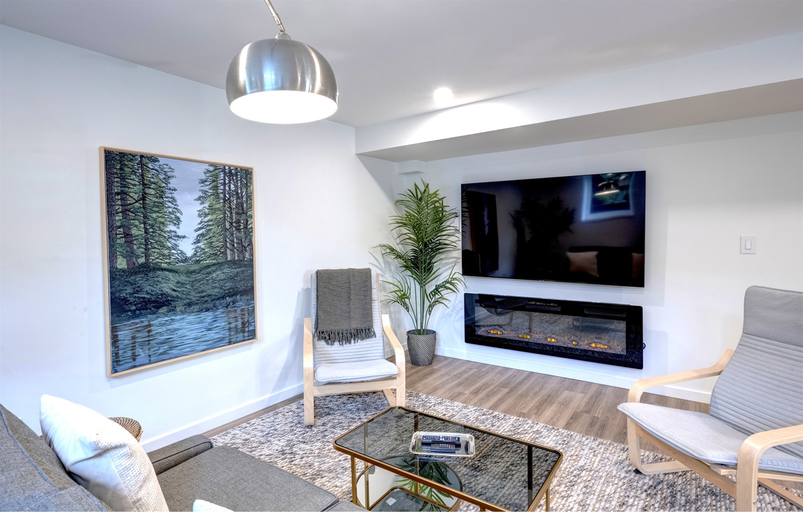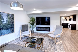 • Spacious living area with oversized Smart TV and fireplace